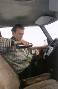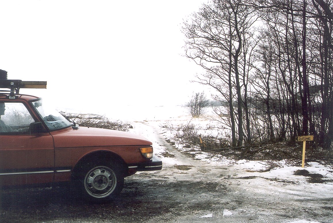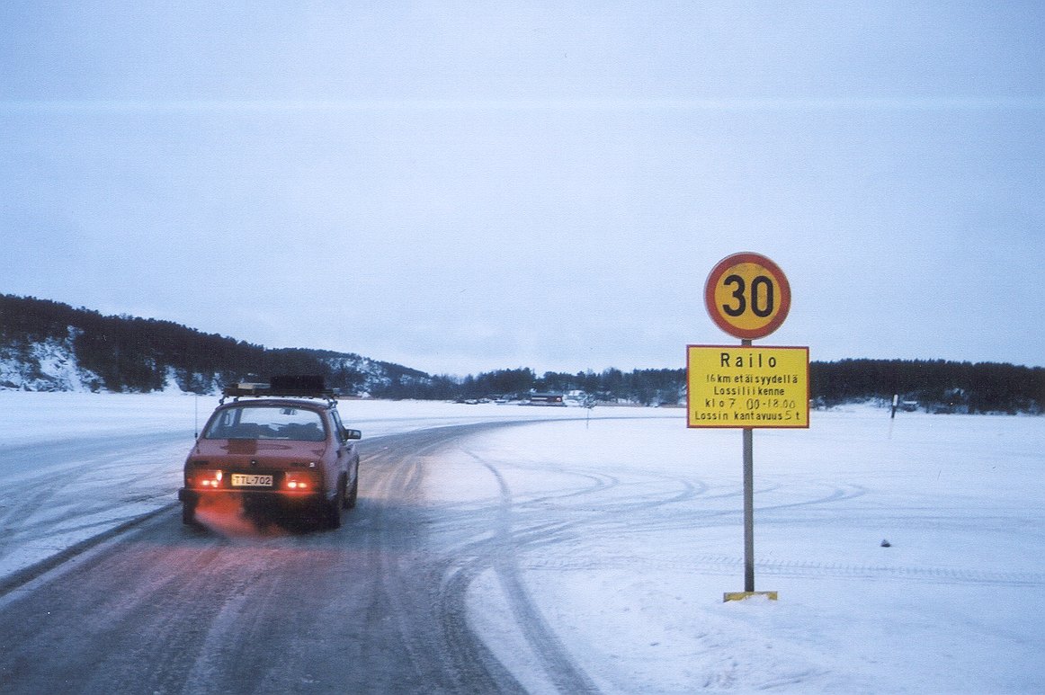 We started the trip at 6 am, by equiping our trusty Saab 99 with warm clothes (for walking outside), some sturdy planks for crossing possible cracks in the ice and hot tea for ourselves. Our best guide was a map taken from Turun Sanomat -newspaper destribing the general route and the start- and end points. Rymättylä was easy to find, and the startpoint was clearly marked. Big signs told that you drive on your own responsibility.. yawn. The first 15 kilometest to the first brigde were like driving a normal, througly frozed paved road. |