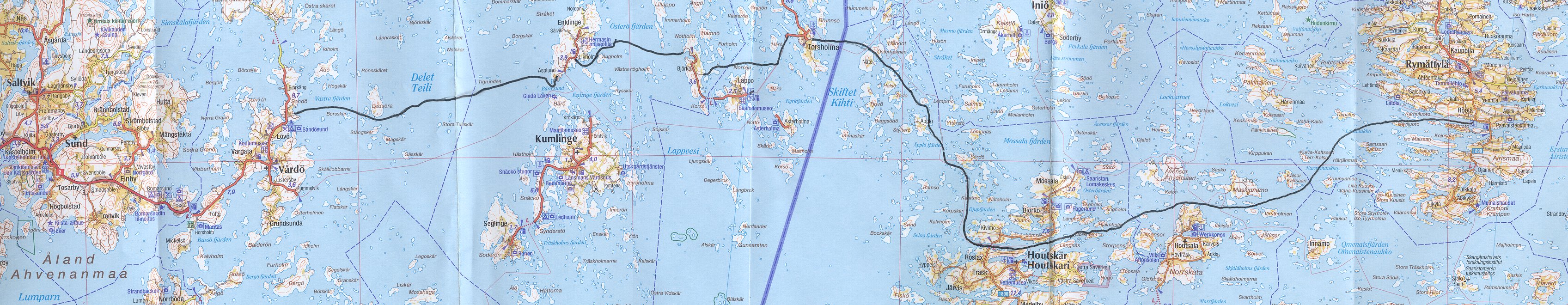 The most widely known has always been the route between Finnish mainland and the Åland islands. The last time this route was officially open was early 1990's. Nothing forbids you to TRY the route even on warmer winters, but only when officially declared the road has all the needed movable bridges over ship paths. The road starts on Rymättylä and goes through/nead the islands Houtskär, Torsholma, Lappo and Enklinge to Vårdö in Åland. The nominal lenght of the route is about 120 kilometres. |