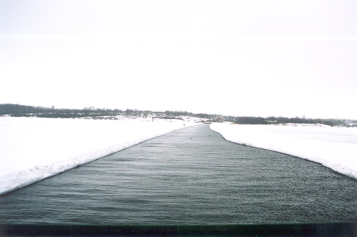 We arrived on the first bridge early enought to see it being towed over the ship channel with a tractor-powered reel. Nice! The actual travel was surprisingly uneventful. We had been expecting gaps in the ice, to be droven over using a makeshift plank "bridge", but the biggest gaps were only about 10 cm wide, and so full of snow that the Saab passed them without problems. Near biggest islands the road branched to tens of side roads, and we mostly drove by luck and some deducting. |