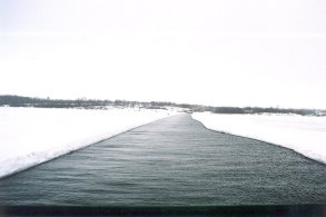 The exact lenght varies from day to day, becouse only the crossing-over are on fixed points. The road itself is generally not marked, you only drive by old tracks. Sometimes an archipelago inhabitant takes a shortcut, or weather makes one place difficult, so everyone drives by another route. You definitely need a map, and a compass is a good help. In a clear area between islands you can miss the route by 10 kilometers before noticing, as we did found out during the trip. The start- and endpoints resemble a normal road, because the traffic is quite heavy (50 cars in an hour), but in the middle the road can be quite hard to find. Near big islands, on the other hand, it's maze. |